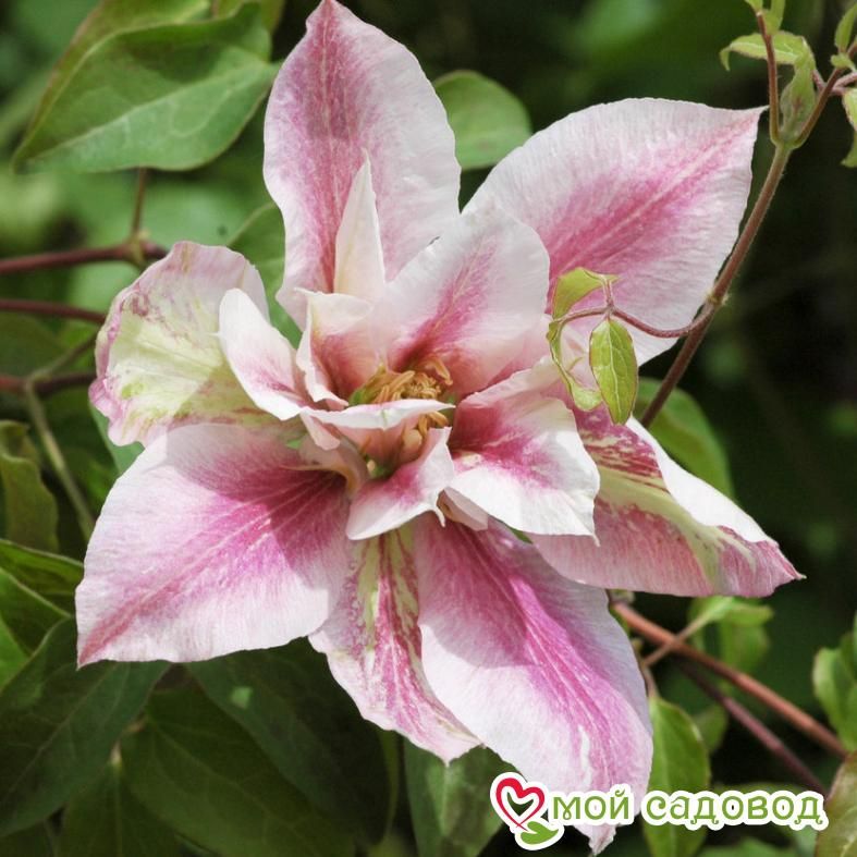 Высота лианы составляет около 4 м. Листва зеленая, тройчатая, с заостренным кончиком. Цветение начинается в мае-июне, на лозе прошлого года. Также оно повторяется в августе-сентябре, но уже на молодых побегах. Цветки полумахровые, одиночные, диаметром 11 – 16 см. Лепестки бело-малиновые, размещенные в 2 ряда. Сердцевинка в виде короны, состоящая из ярко-желтых тычинок. Аромат тонкий и приятный.